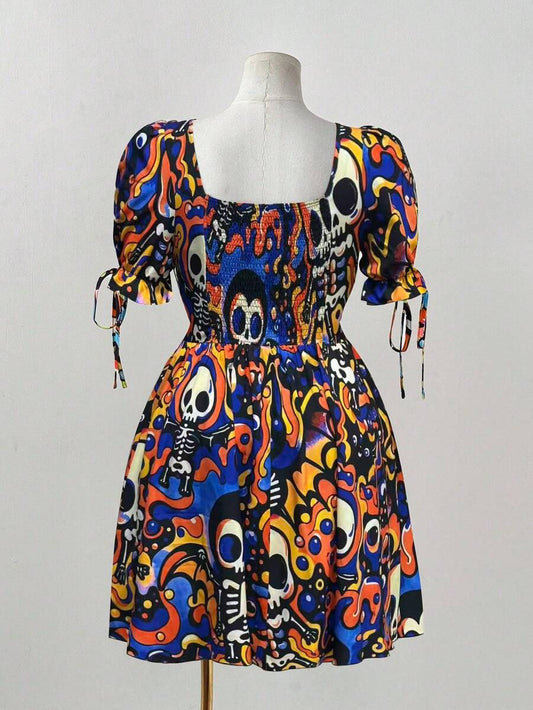 Y2K Dark Skull Skeleton Short Sleeve Dress for a Spooky Halloween Look