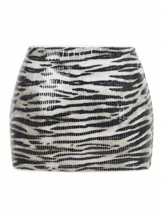 Y2Kool Women's Zebra Print Sequin Mini Skirt for Halloween Parties and Holiday Flair