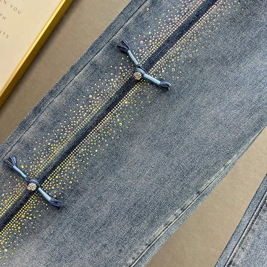Women Sequins Tassel Wide Leg Blue Denim High Waist Jeans Trousers