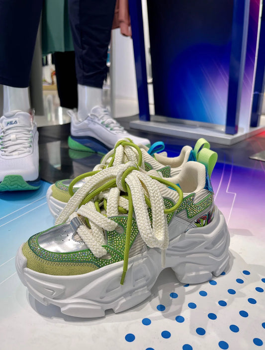 Women High Heels Platform Shoes Green Chunky Sneakers Real Leather Thick Sole Crystal