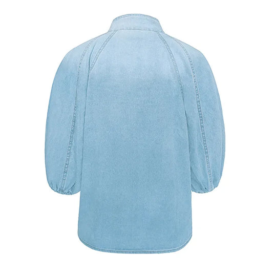 Women Denim Top Turtleneck Splice Puff Sleeve Shirts Loose Solid Pullovers Casual