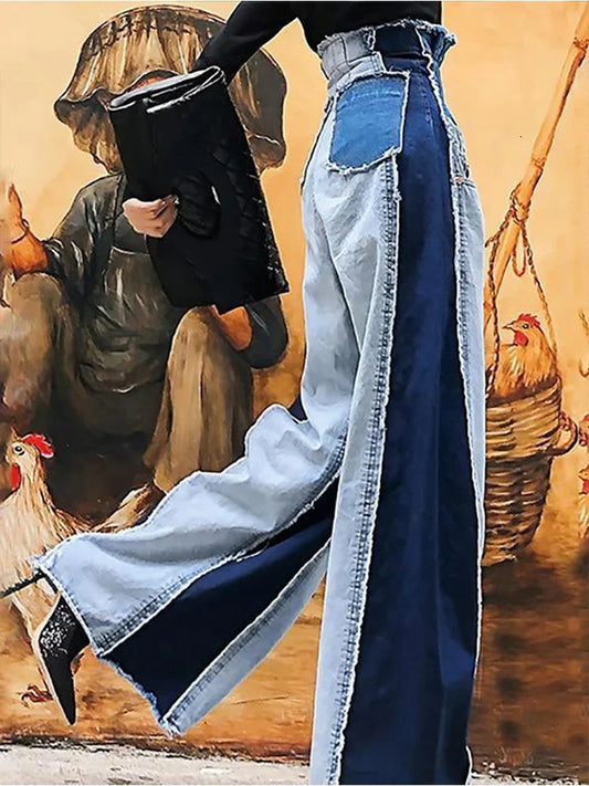 Women High Waist Jeans Patwork Denim Pants Casual Colorblock Patchwork Raw Trim Wide Leg