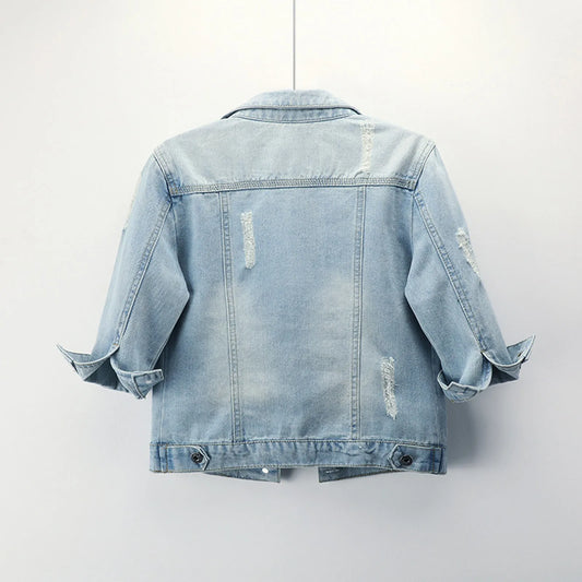 Women Cropped Coats 3/4 Sleeve Retro Short Denim Jackets Light Blue Jeans Coat