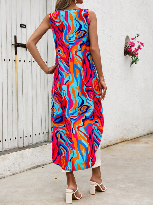 Women's Marble Printed High-Low Hem Sleeveless Casual Shirt - Perfect for Vacation