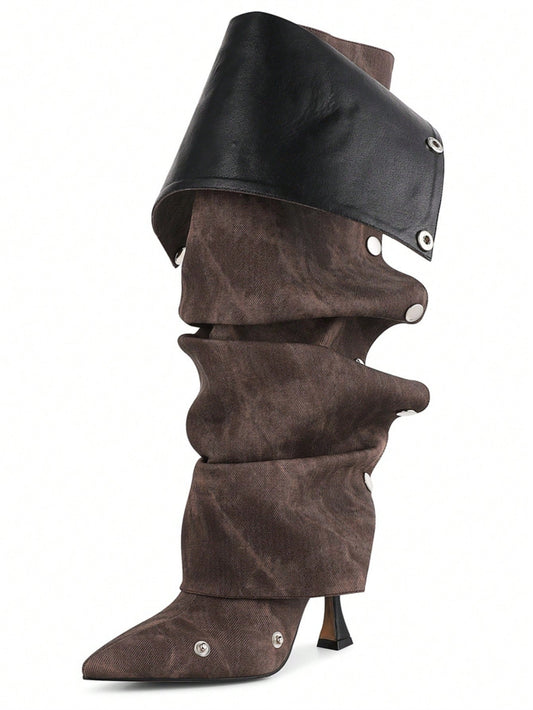 Women's Knee-High Stiletto Boots with Ruched Slouchy Design and Detachable Snap-Off Panel