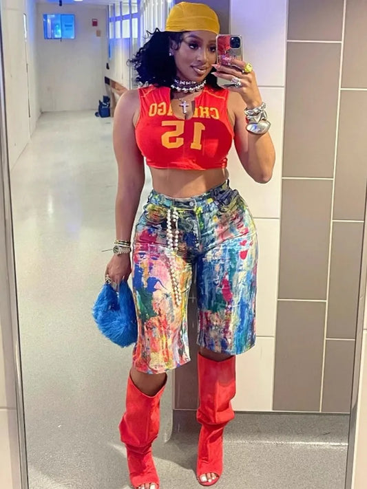 Women's Pockets Graffiti Shorts Polyester Mid Waist Shorts