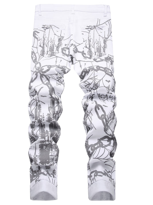 [Trendy Casual] Men's Slim Fit Printed Denim Jeans with Chain & Spider Web Design, Cotton Blend Stretch Casual Pants