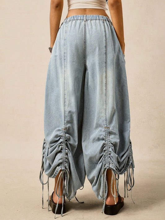 Women Streetwear Cutout Hollow Out Criss Cross Side Wide Leg Blue Denim Pants