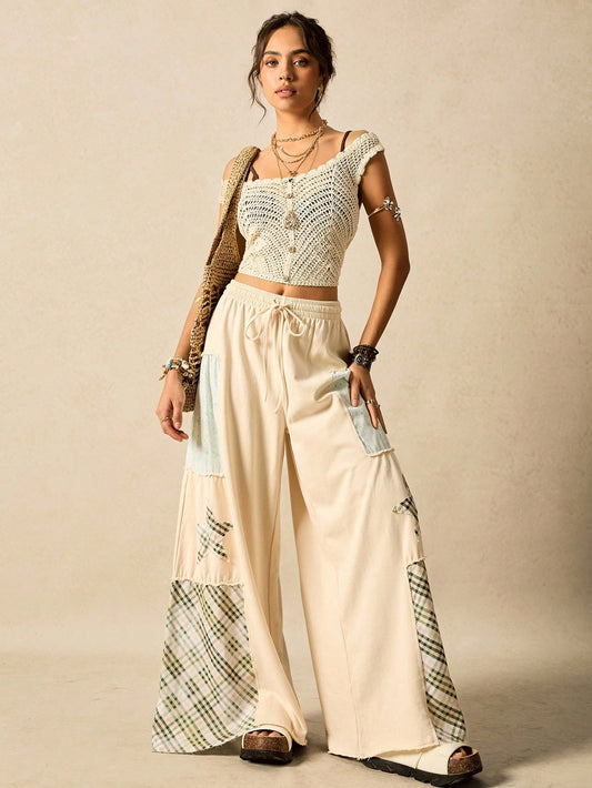 Vintage Floral Wide Leg Pants with Lace Patchwork - Casual Grunge Streetwear