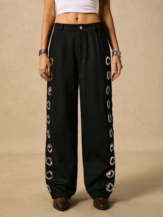 Vintage Cutout Hollow Out Criss Cross Straight Denim Pants High Waist Wide Leg Jeans Trousers