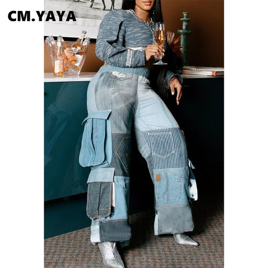 CM.YAYA Women Printed Organ Pocket Side Wide Leg Pants 2023 Autumn Winter Streetwear Cargo Safari Style Trousers