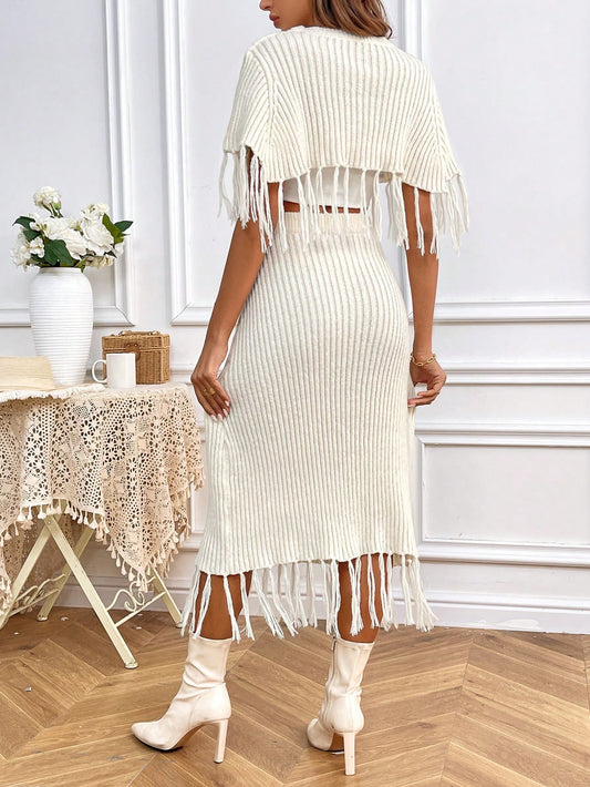 Chic Women's Fringe Hem Patchwork Sweater and Skirt Set for Stylish Outfits