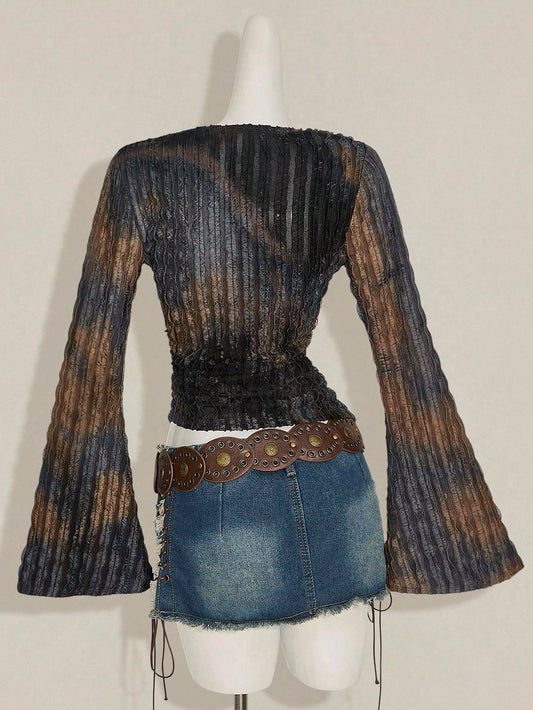 Boho Vintage Off-Shoulder Tie-Dye T-Shirt with Flare Sleeves for Fall Fashion