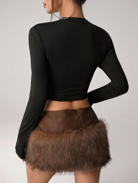 Hollow Underwire Long Sleeve Sexy Fitted T-Shirt for Women - Chic Black Top