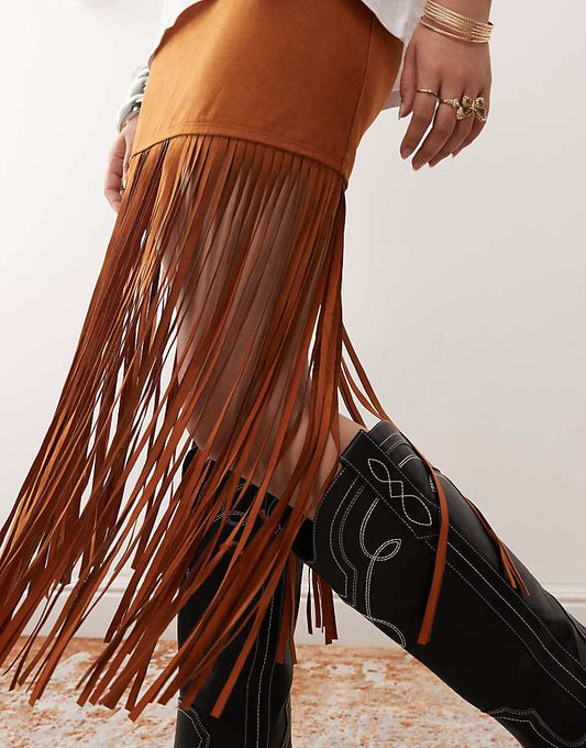 Trendy Tan Suedette Fringe Skirt for Festival-Ready Style