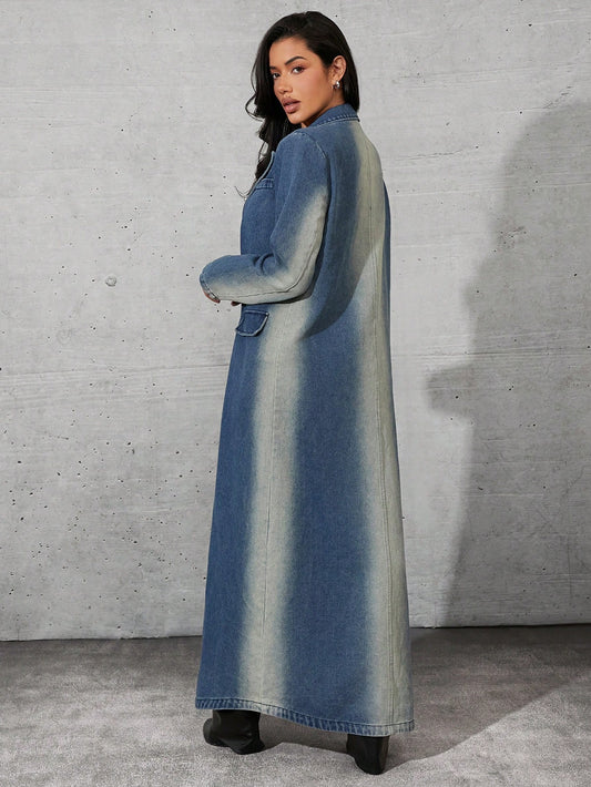 Trendy Women's Denim Faux Pocket Long Cargo Trench Coat for Casual Fall and Winter Outings