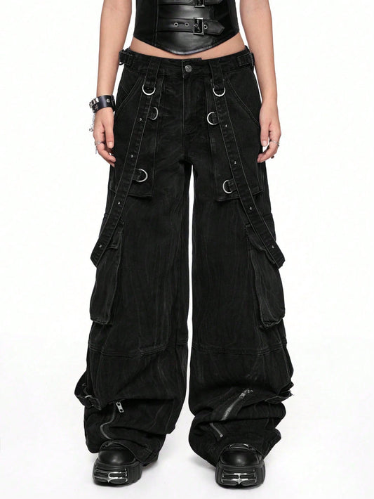 Punk Retro Grunge Wide Leg Cargo Jeans for Women - Low Waist Boyfriend Fit with Rivet Webbing