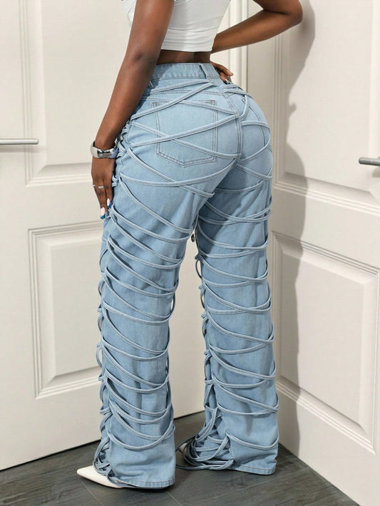 Personalized Lace-Up High Waist Straight Leg Jeans for Women - Trendy Fall Fashion