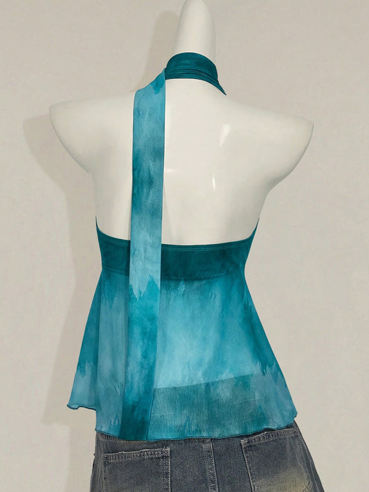 Trendy Y2K Teal Ombre Boho Halter Tank Top for Women - Perfect for Summer & Beach Outings