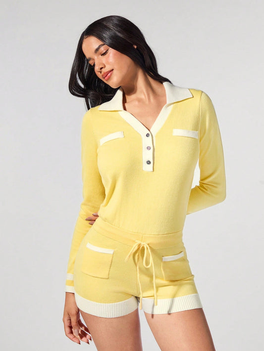 Chic Contrast Color Long Sleeve Polo Collar Knitted Romper for Women - Perfect for Fall & Winter
