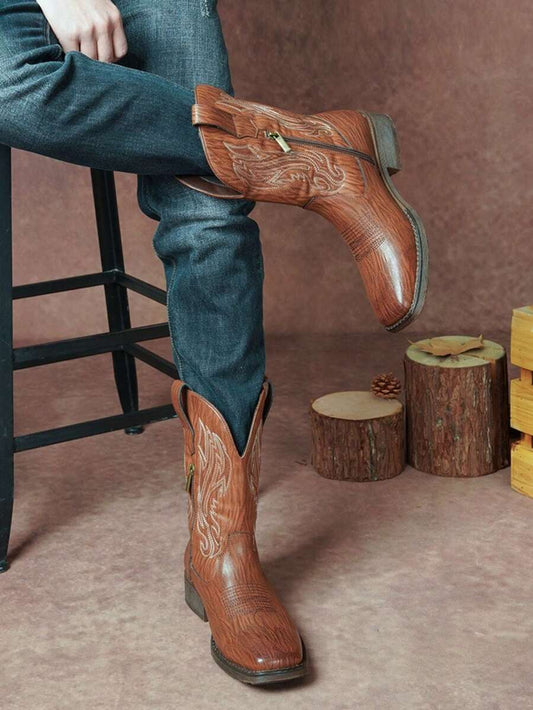 Retro Square Toe Dark Brown Embroidered Cowboy Boots for Men - VOSTEY SHOE MORE