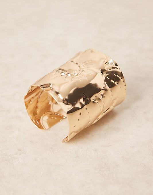 Elegant Gold Tone Wide Cuff Bracelet with Intricate Floral Design