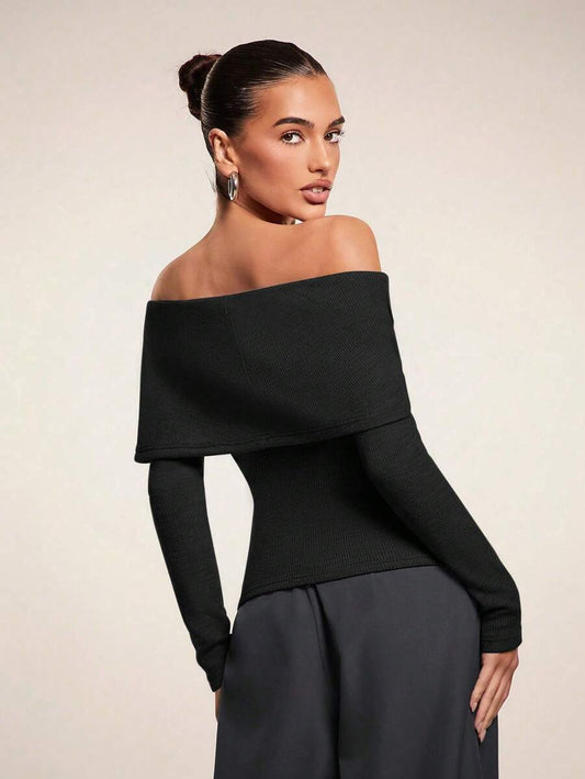 Elegant Off-Shoulder Leather Patch T-Shirt for Women – Perfect for Holidays, Casual Outings, and Goddess Style