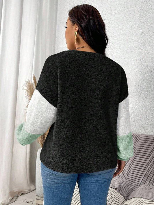 Cozy Chic: Plus Size EMERY ROSE Color Block Crew Neck Sweatshirt for Women - Perfect Fall & Winter Essential