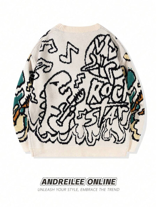 Unisex Dinosaur Pattern V-Neck Slouchy Knit Sweater - Trendy Casual Wear for All Seasons