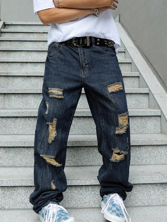 Men's Mid-Rise Ripped Jeans with Flag Waistband - Full Length Straight Leg Style