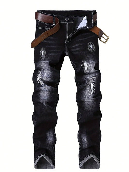 Men's Slim Fit Stretch Ripped Jeans with Embroidery - Stylish Worn Denim for Trendy Looks