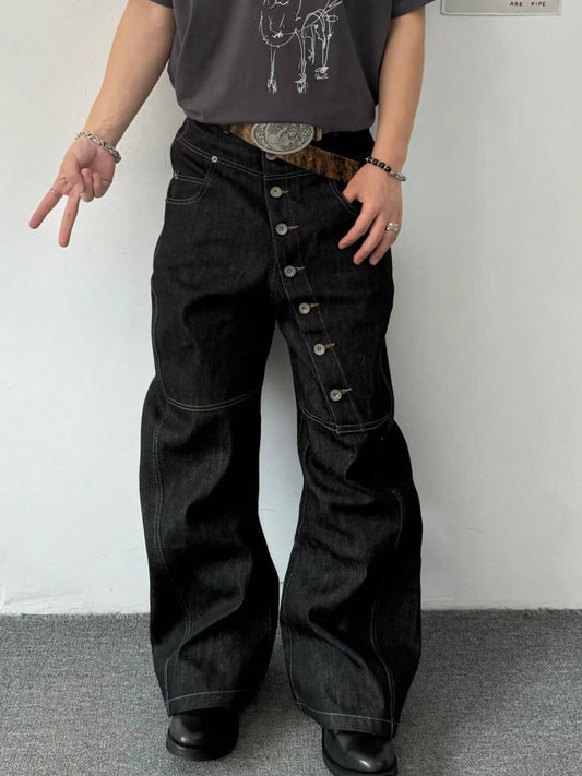 Retro Curved Long-Breasted Design Jeans for Men - 2025 High-Street Loose Wide-Leg Floor-Length Pants