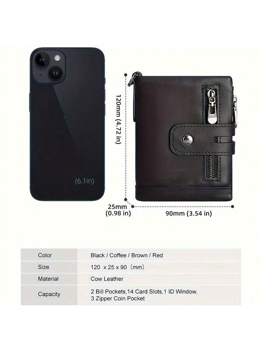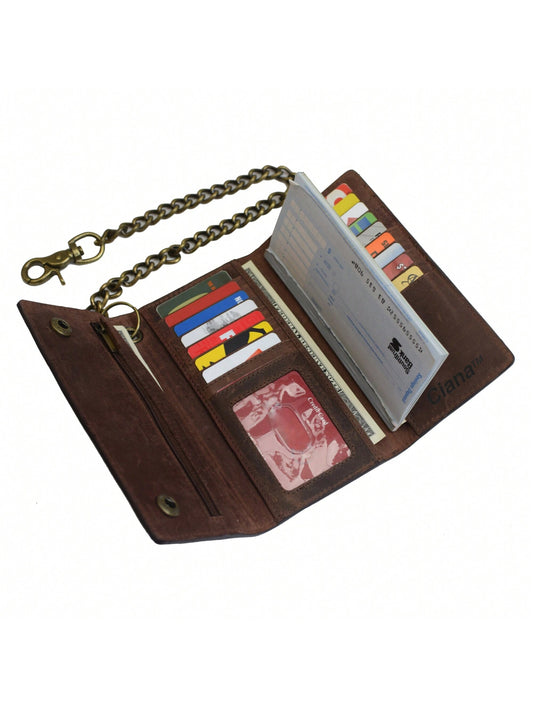 Men's Genuine Leather Wallet with Chain - RFID Blocking Bifold with Double Zipper and Anti-Theft Coin Pocket