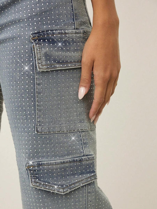 Mid Waist Black Rhinestone Cargo Jeans for Women – Chic Multi-Pocket Casual Style for Winter and Fall Events
