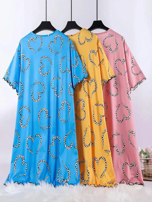 Plus Size Women's 3-Piece Pajama Set with Heart Print, Ruffled Hem & Short Sleeves - Comfortable Machine Washable Nightgown in Blue, Yellow, and Pink