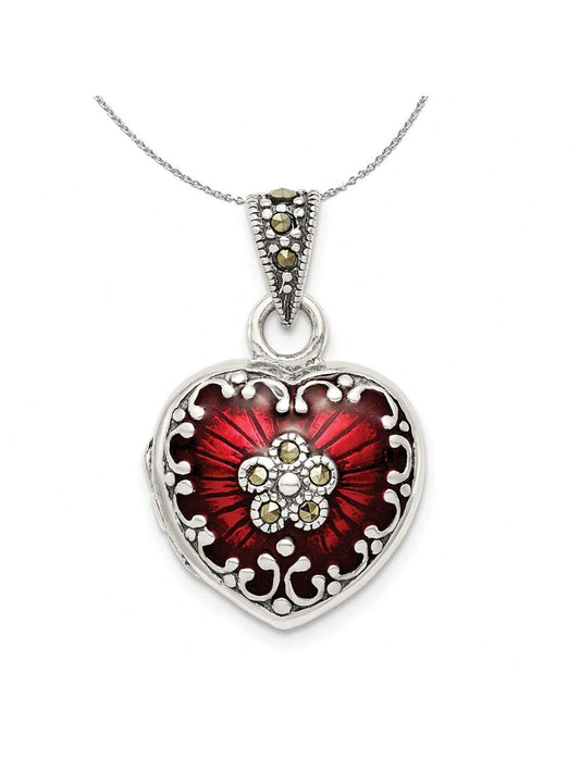 Antiqued Heart Locket Necklace with Black Bow, Red Enamel, and Marcasite Accents
