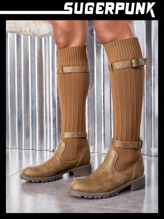Summer-Ready Women's Fashionable Knitted Knee-High Boots with Ruched Design and Buckle Accents