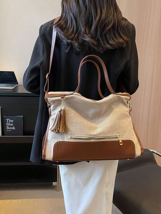 Stylish Large Shoulder Tote Bag with Zip Front and Tassel Decor - Perfect for Students and College Essentials