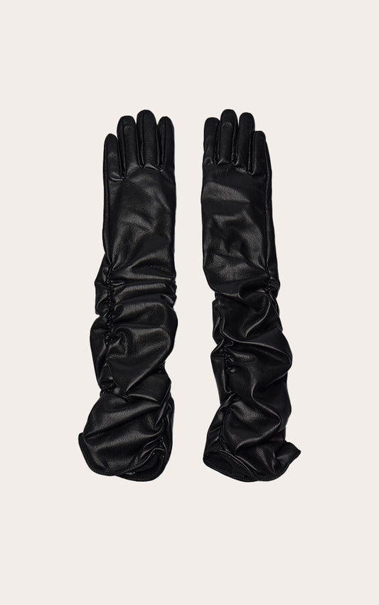 Elegant Black Faux Leather Long Ruched Gloves for Chic Style
