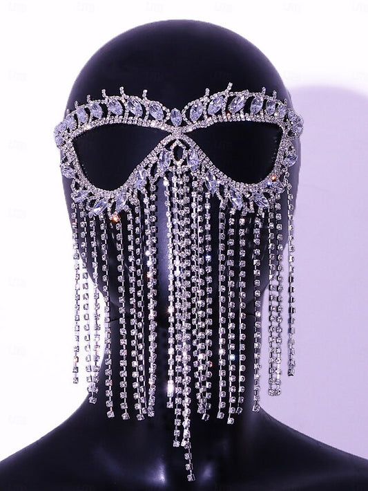 Sparkling Crystal Rhinestone Fringe Mask Headpiece - Glamorous Face Chain for Gatsby Parties and Evening Events