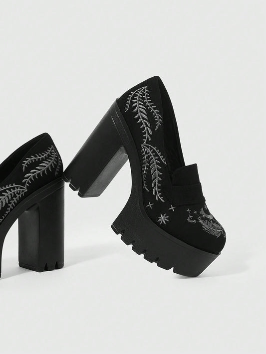 Gothic Style Suede Chunky Heel Pumps with Embroidered Moon Design for Trendy Spring and Autumn Fashion