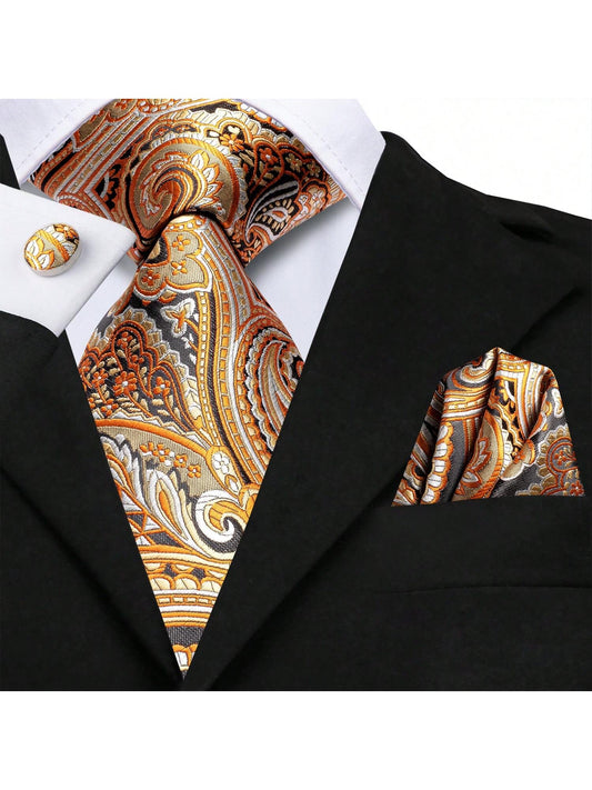 Elegant 5-Piece Men's Tie Set with Gold Pattern Necktie, Pocket Square, Cufflinks, and Accessories for Weddings and Office Wear