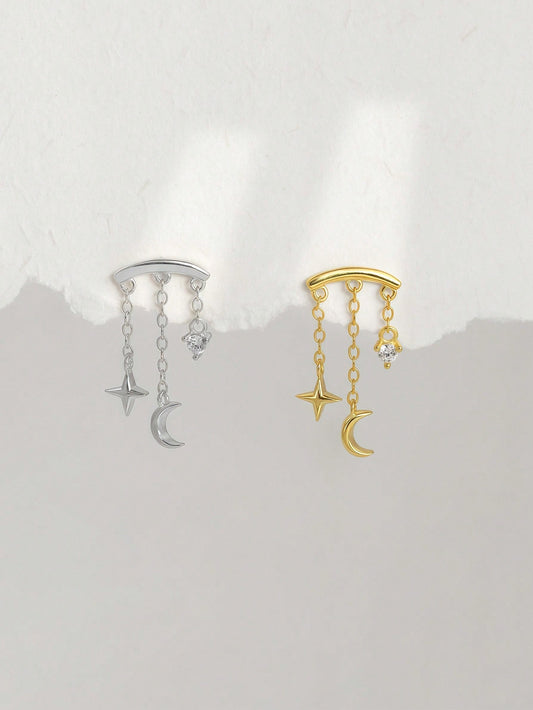 Romantic Moon & Star Zirconia Tassel Threaded Labret Earrings - Hypoallergenic 925 Sterling Silver for Men & Women - Perfect for Daily Wear & Special Occasions