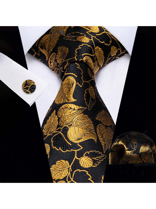 Elegant 3-Piece Floral Necktie, Cufflinks, and Hanky Set for All Seasons - Vintage Golden Jacquard Style