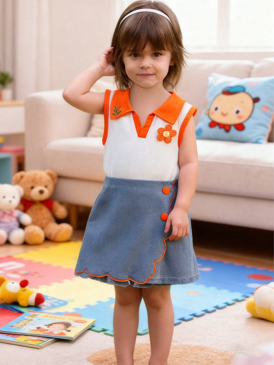 Charming Summer 2-Piece Set for Young Girls: 3D Flower Knitted Top & Denim Ruffled Scarf