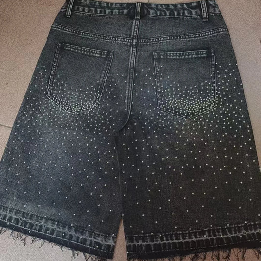 Streetwear Unisex Cross Rhinestone Denim Shorts Y2K Jeans Hip Hop Cross Sequins Vintage Baggy Gym Shorts Basketball Shorts
