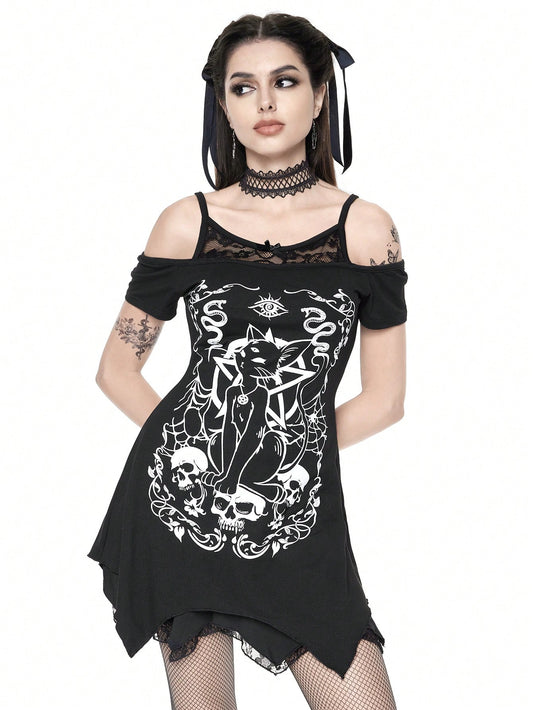 Gothic Spring Vibes: Off-Shoulder Black T-Shirt with Unique Cat and Skull Design