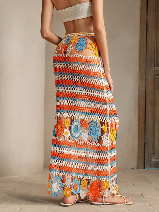 Chic Striped Color Block Hollow-Out Knitted Maxi Skirt for Stylish Summer Beach Days