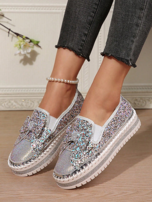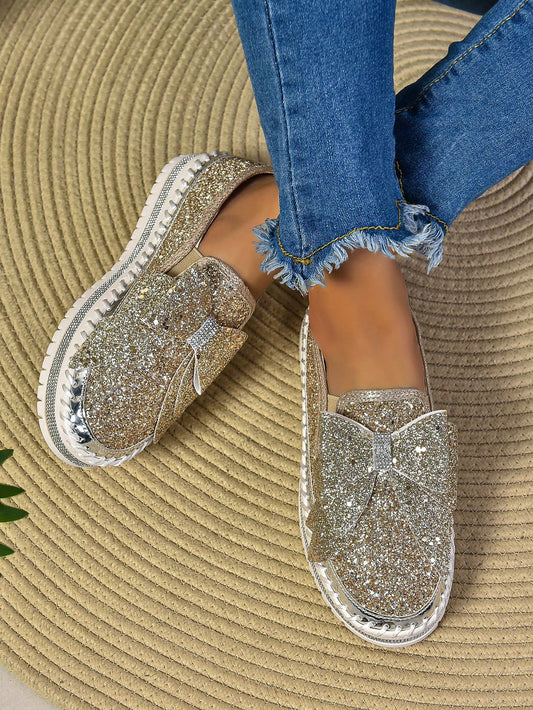 Chic Rhinestone Slip-On Loafers for Women - Stylish Casual Shoes with Bowknot Detail