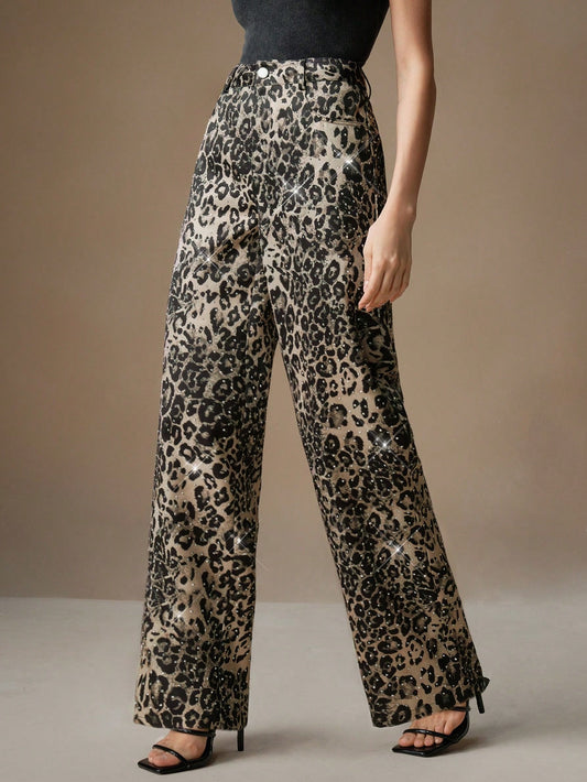 Elegant Leopard Print Pants with Rhinestone Accents for Women